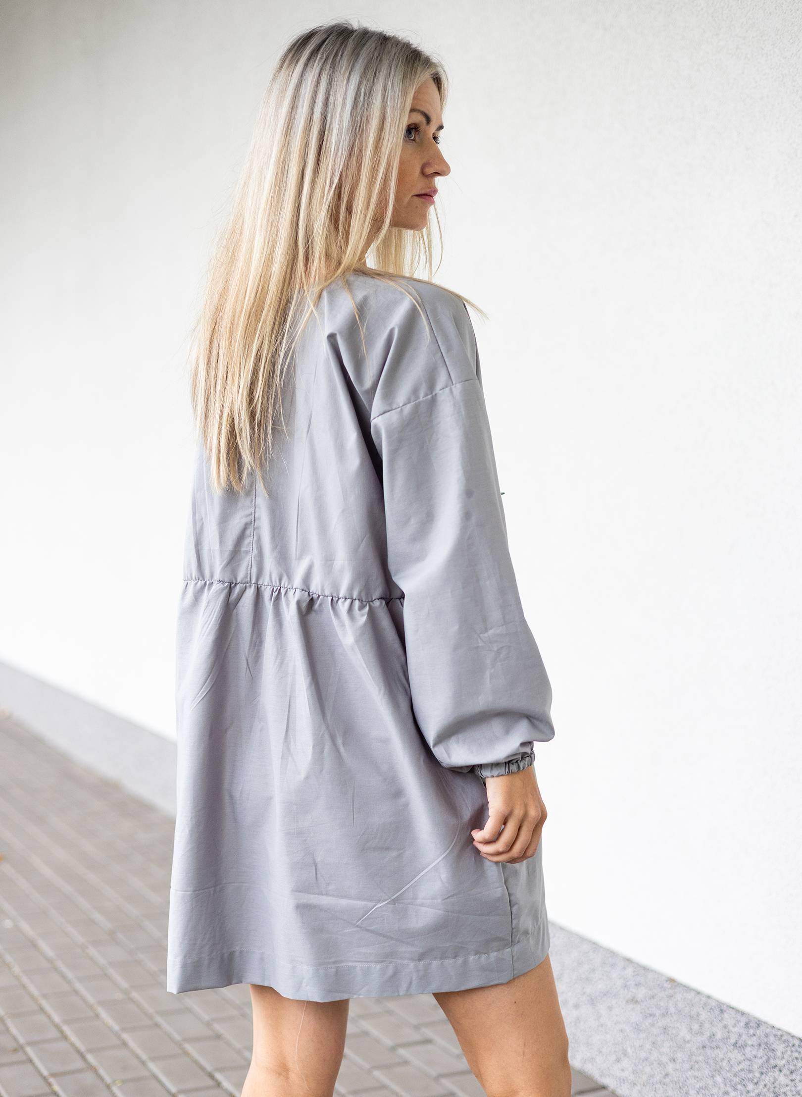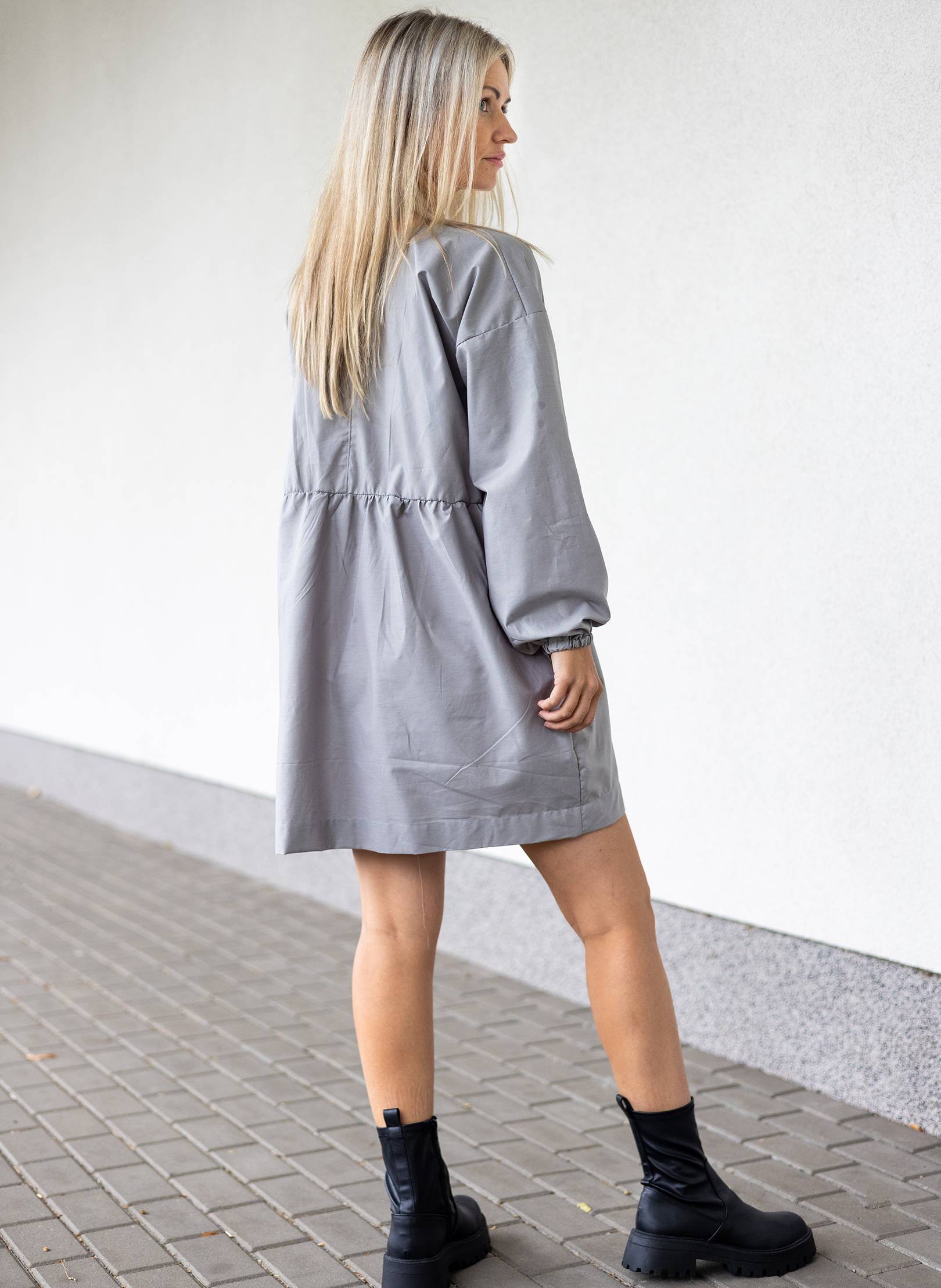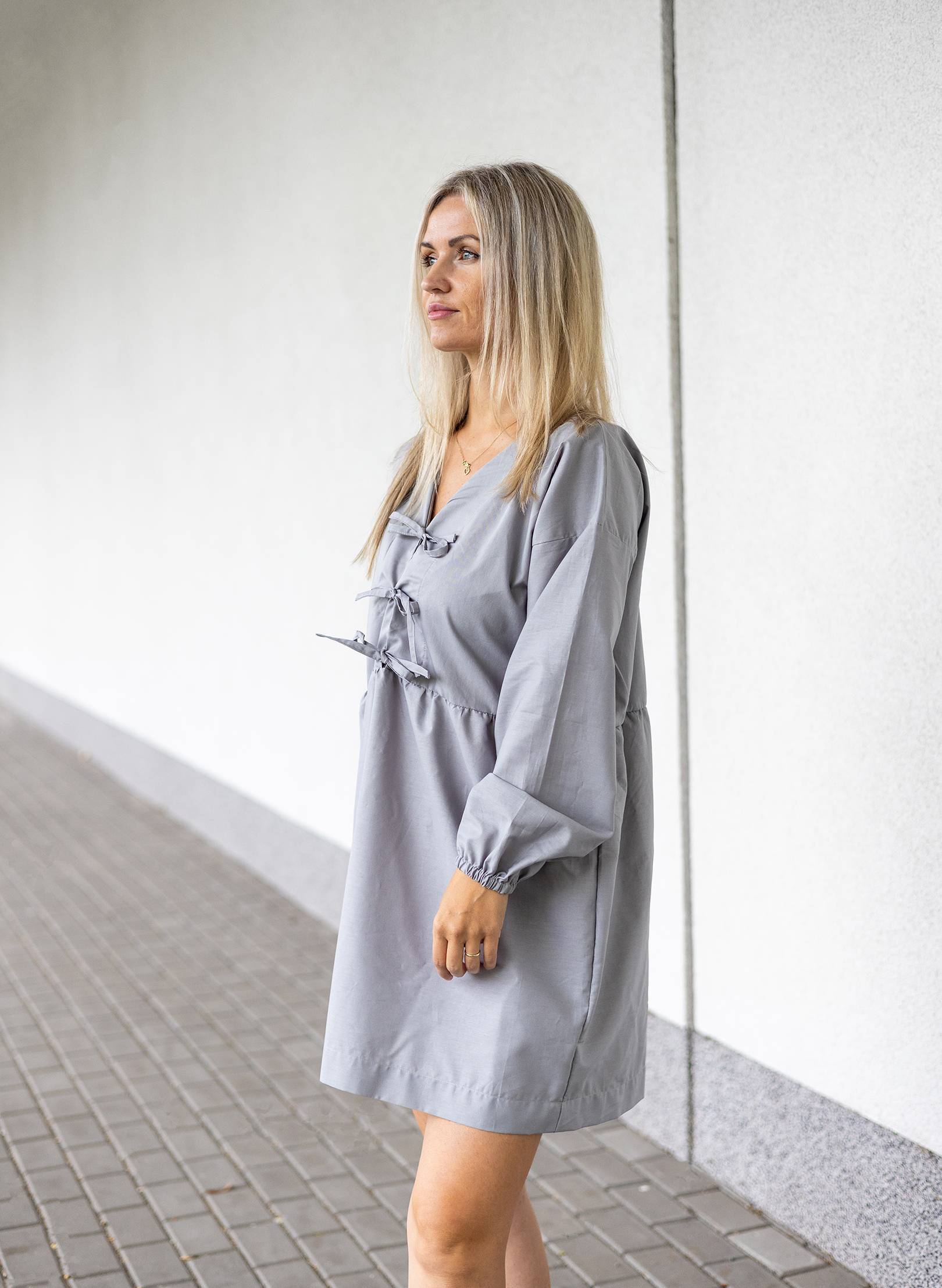 Minimalistické a designové šaty volného střihu s dlouhými rukávy , které jsou zakončené na gumu. Decentní vázání vepředu dodává šatům jemný akcent.