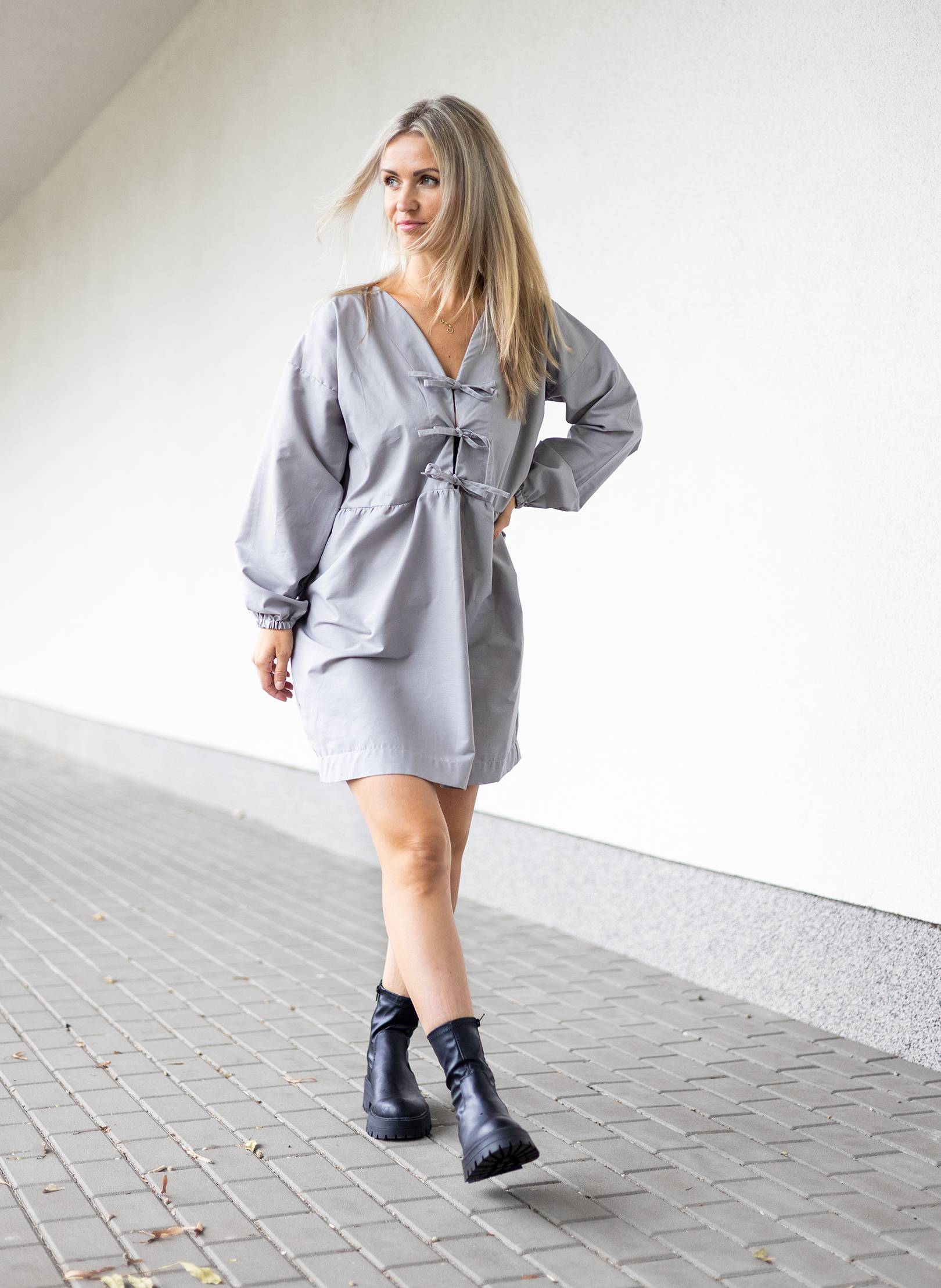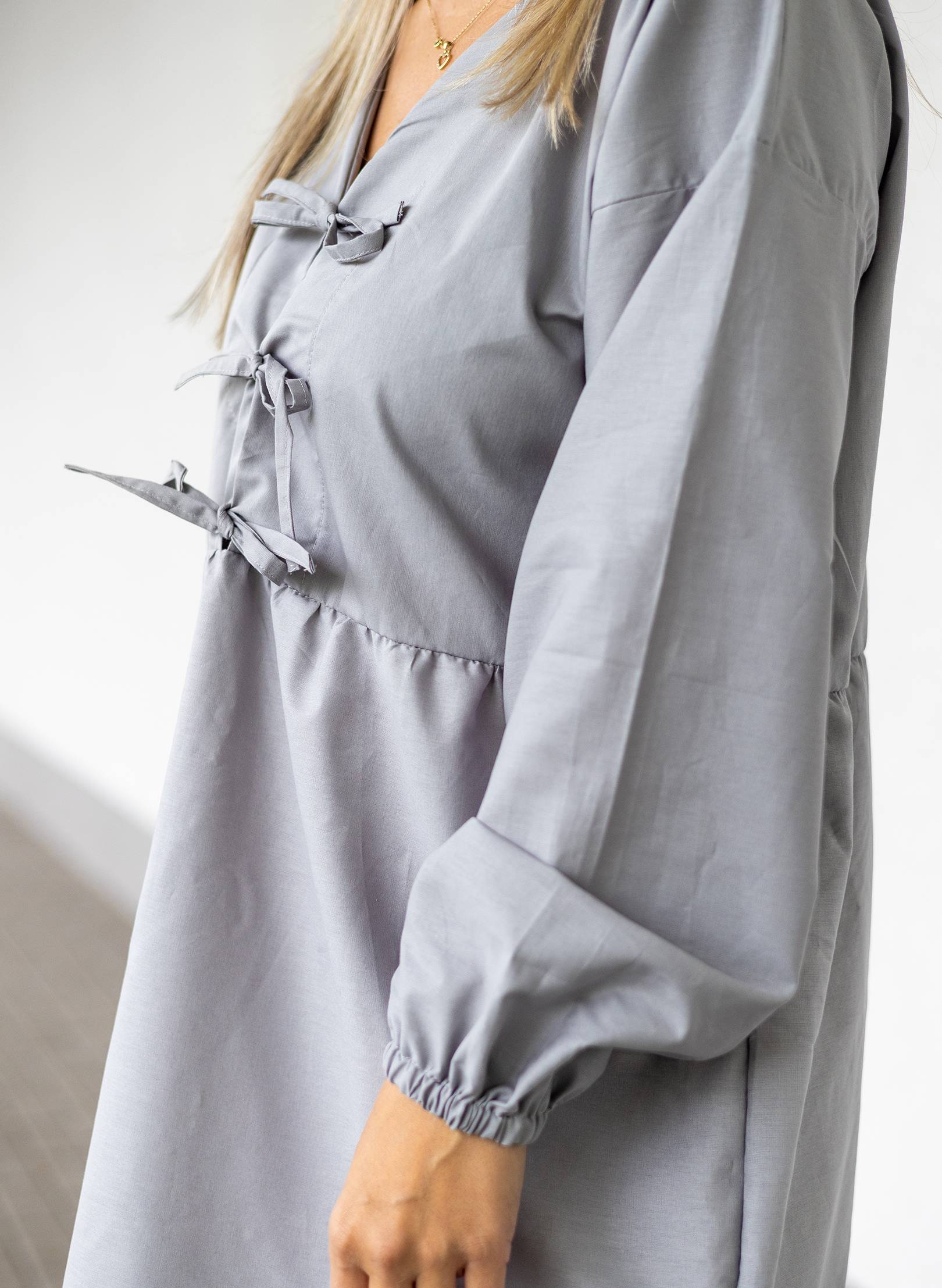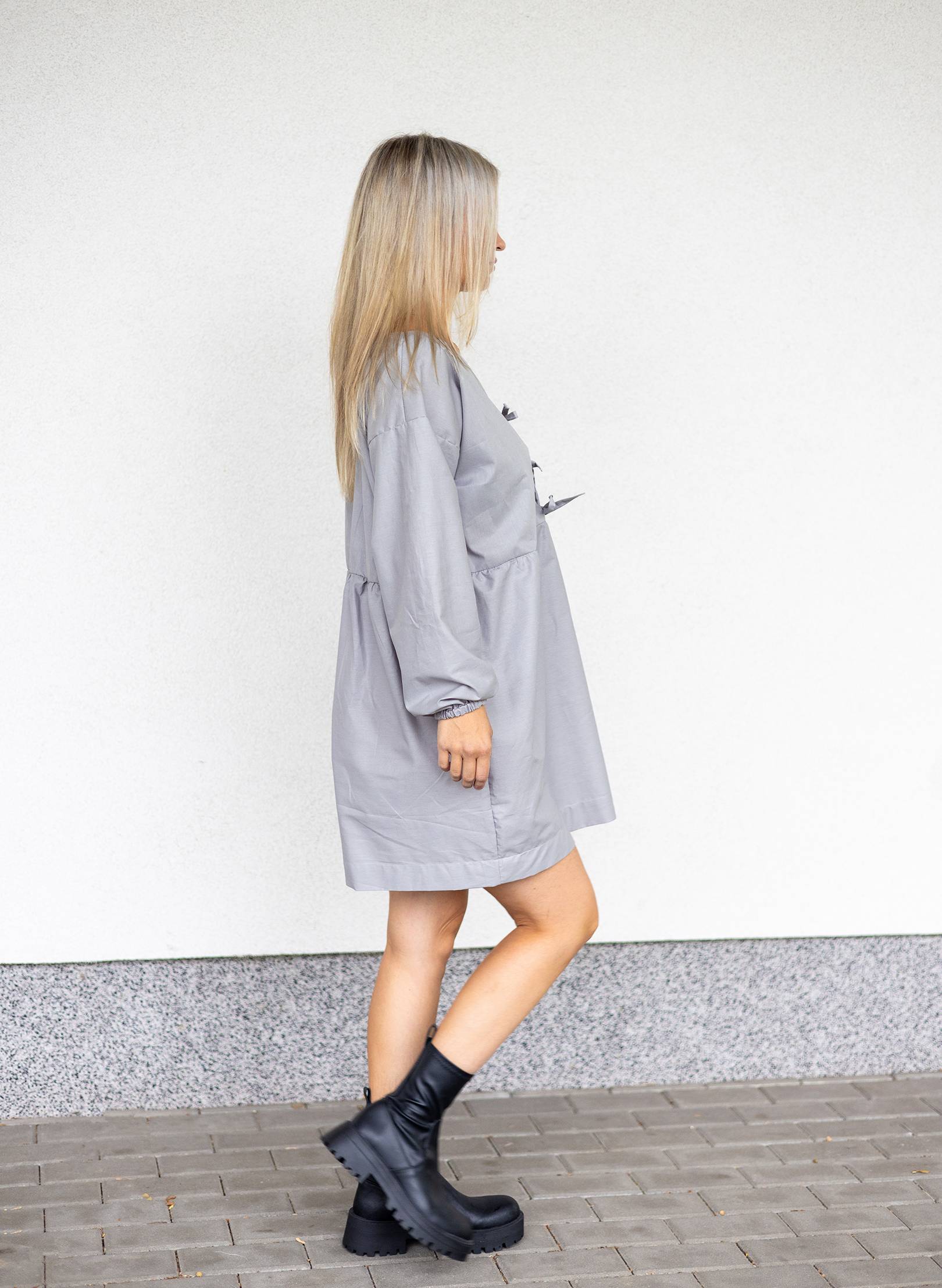Minimalistické a designové šaty volného střihu s dlouhými rukávy , které jsou zakončené na gumu. Decentní vázání vepředu dodává šatům jemný akcent.